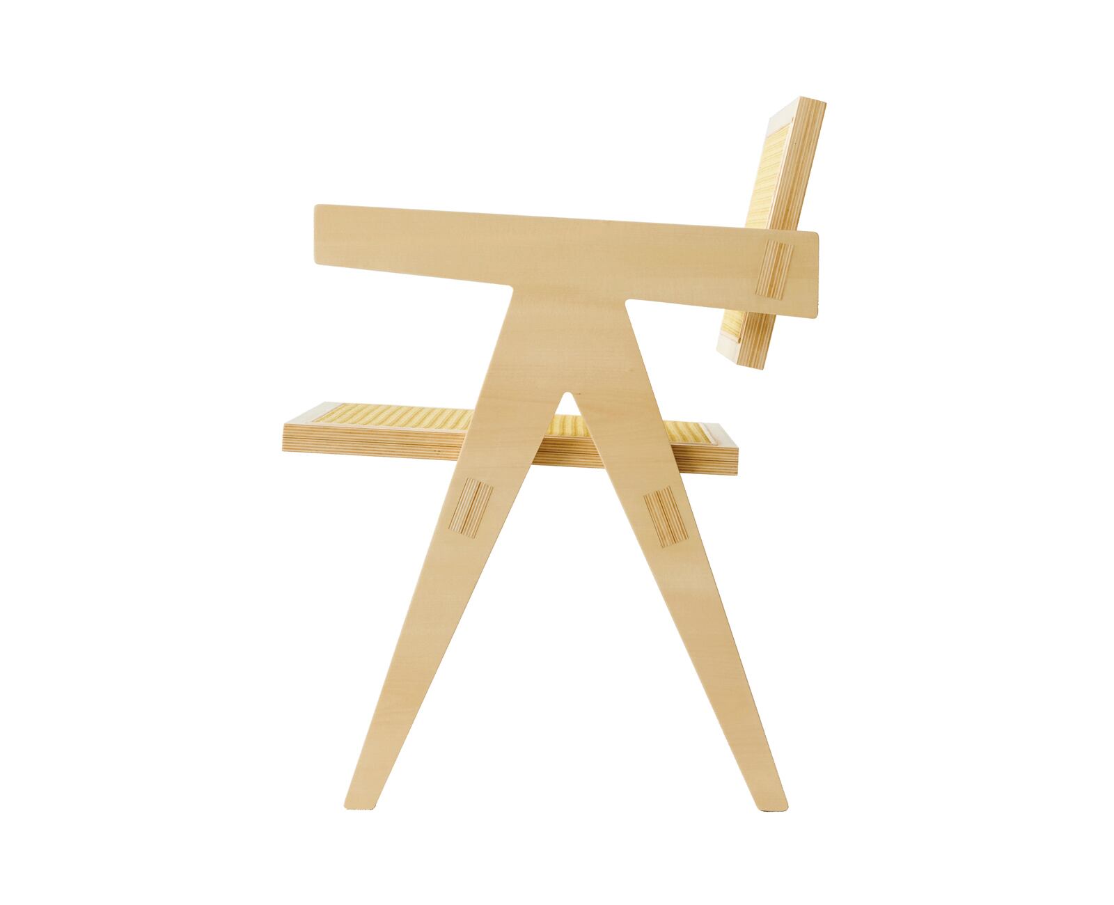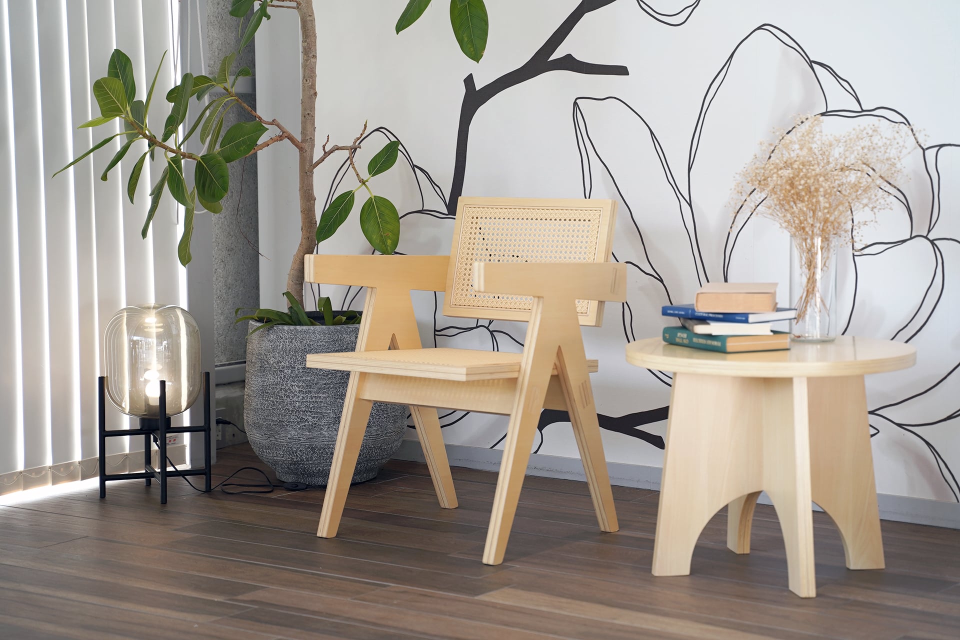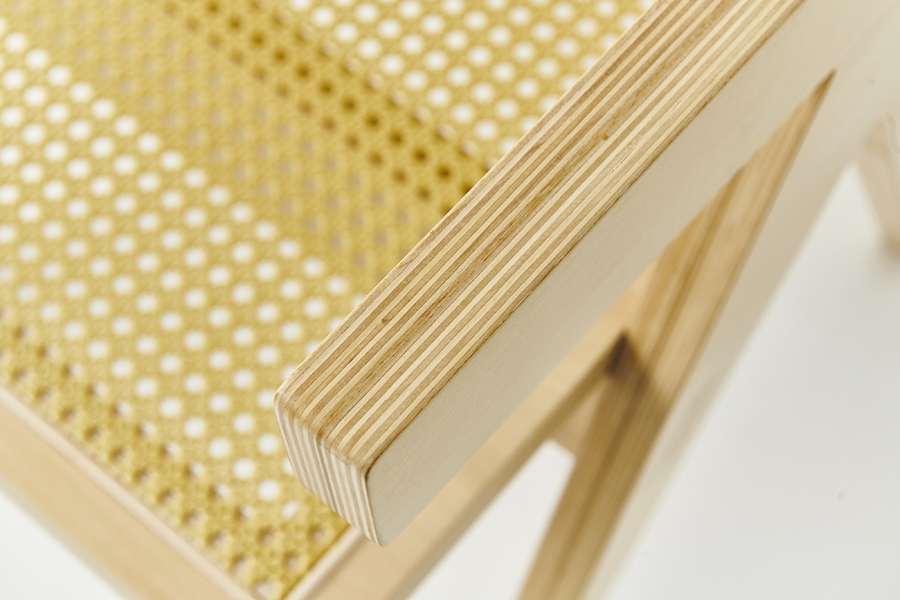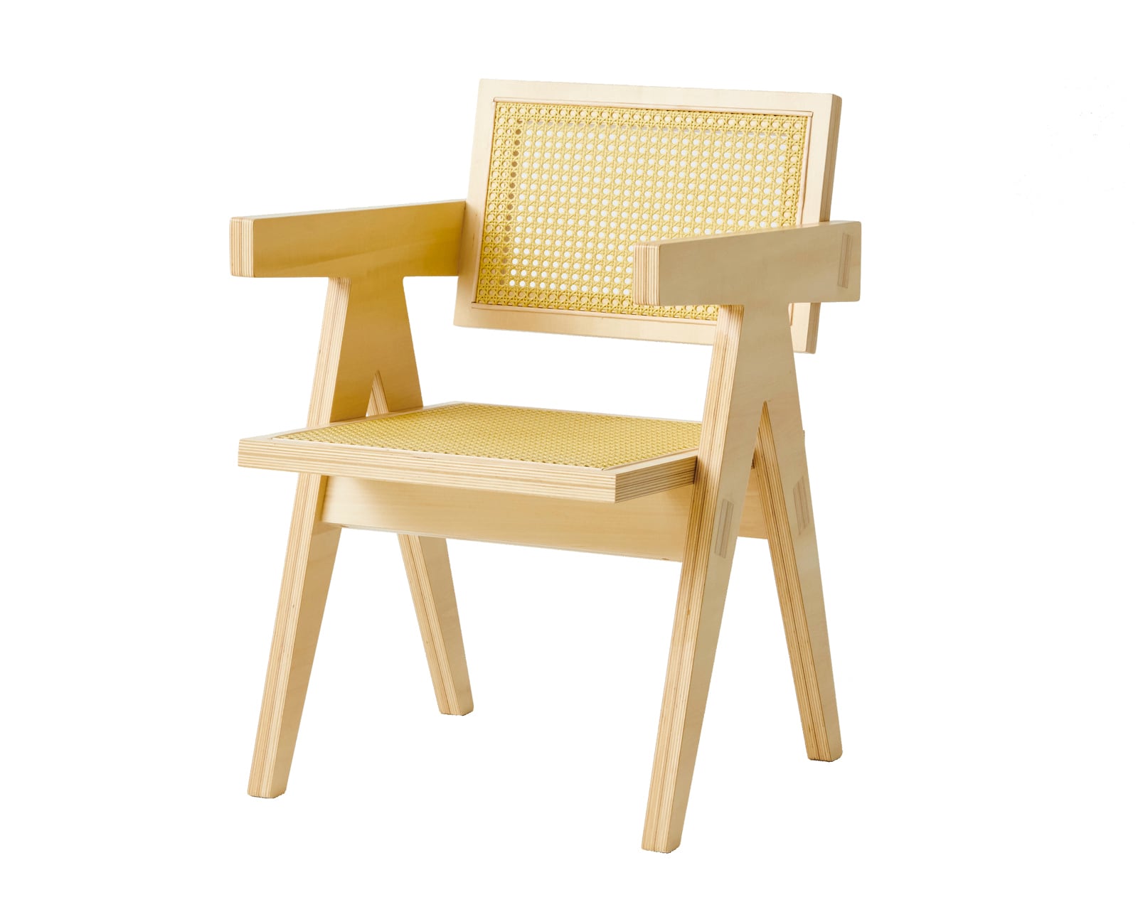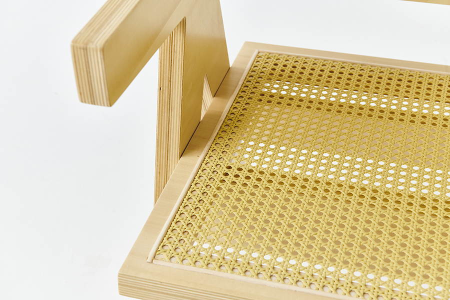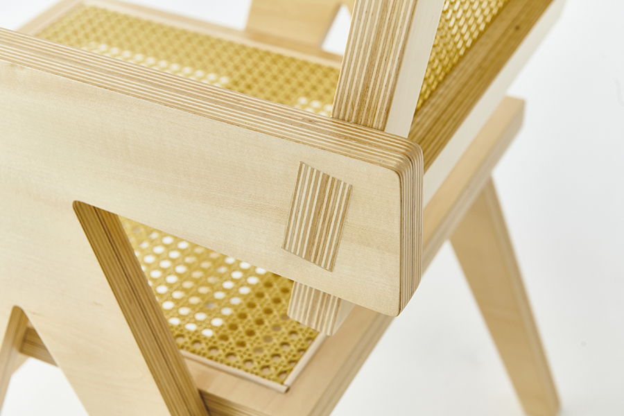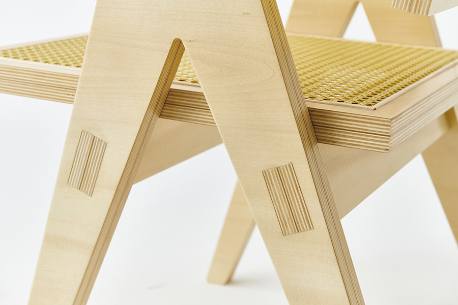 現地で手に入る素材を使い、特別な設備がなくても作れるよう考えられた彼の設計理念をもとに、成形合板とPVCラタンで再構築しました。素朴でありながら、構造の美しさが際立つ一脚です。