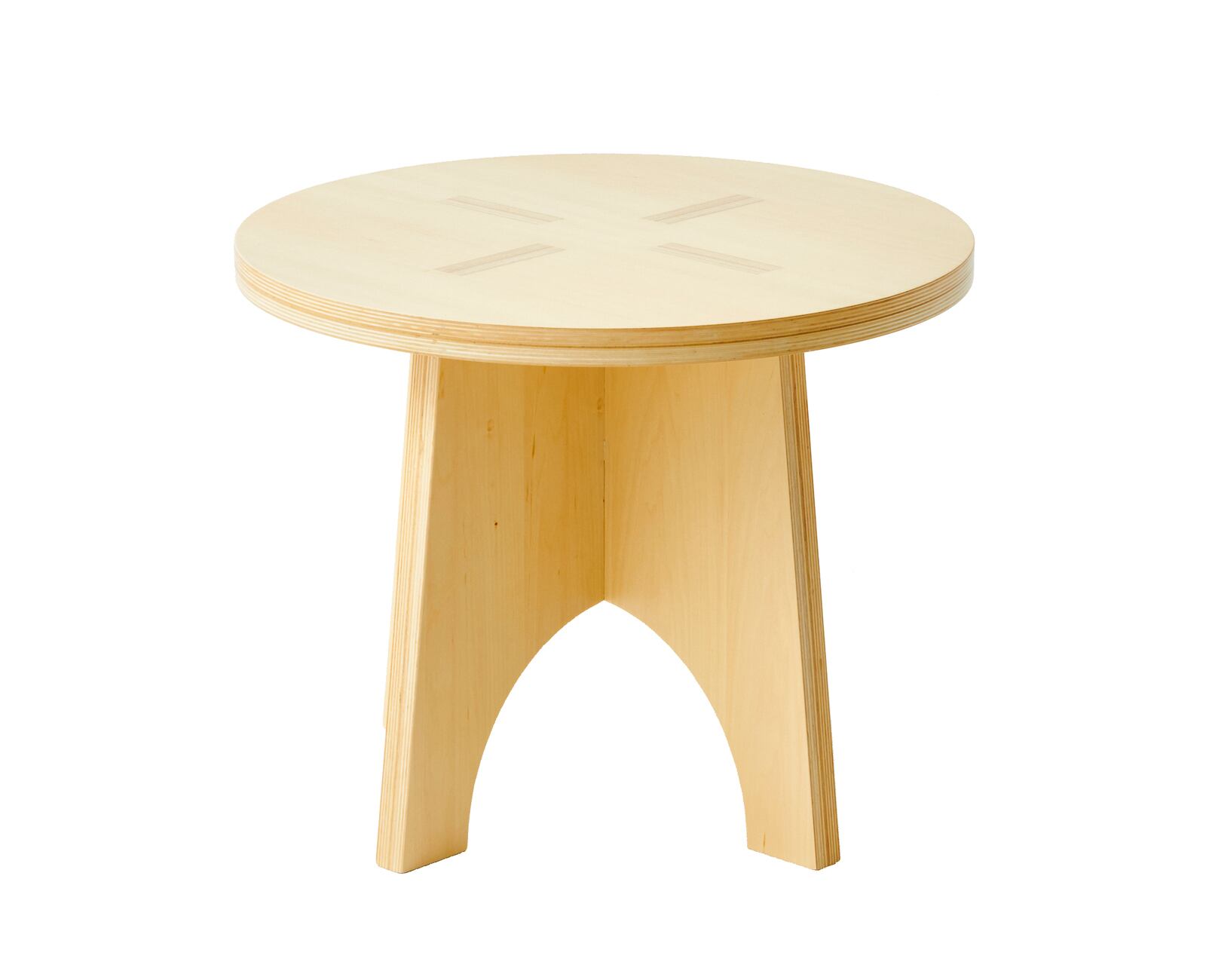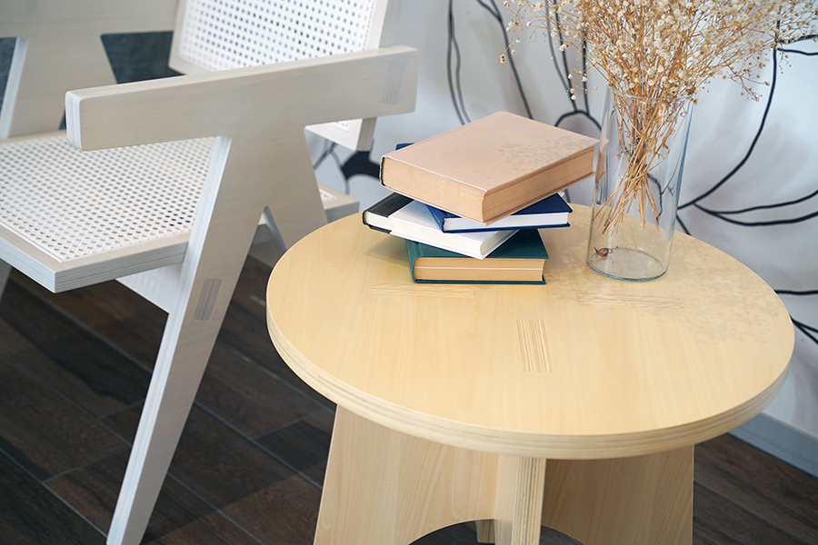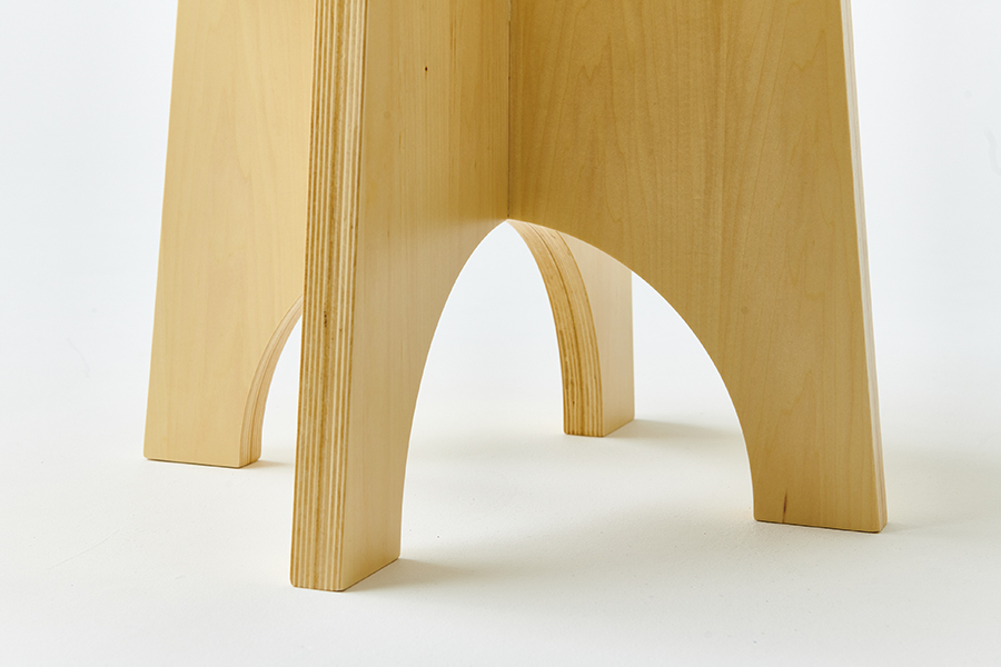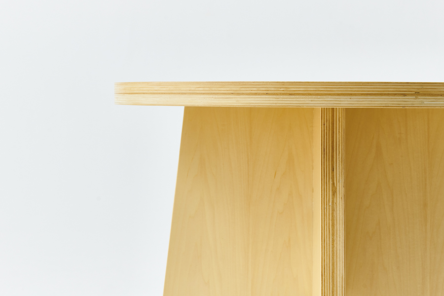 合板の2次元的な直線を活かした構成で、素材の積層やジョイントがデザインとして現れています。天板と脚の接合部も、あえて見せることで構造の美しさもデザインとして楽しめます。