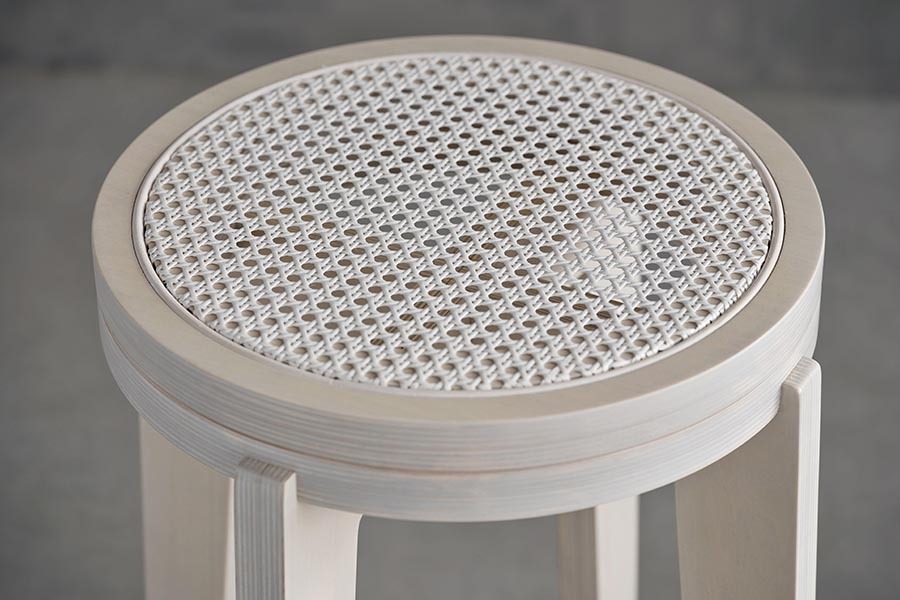 シナ合板の積層がつくる素朴な陰影と、PVCラタンの軽やかな編み目が、空間にほどよい緊張感と温もりを添えます。